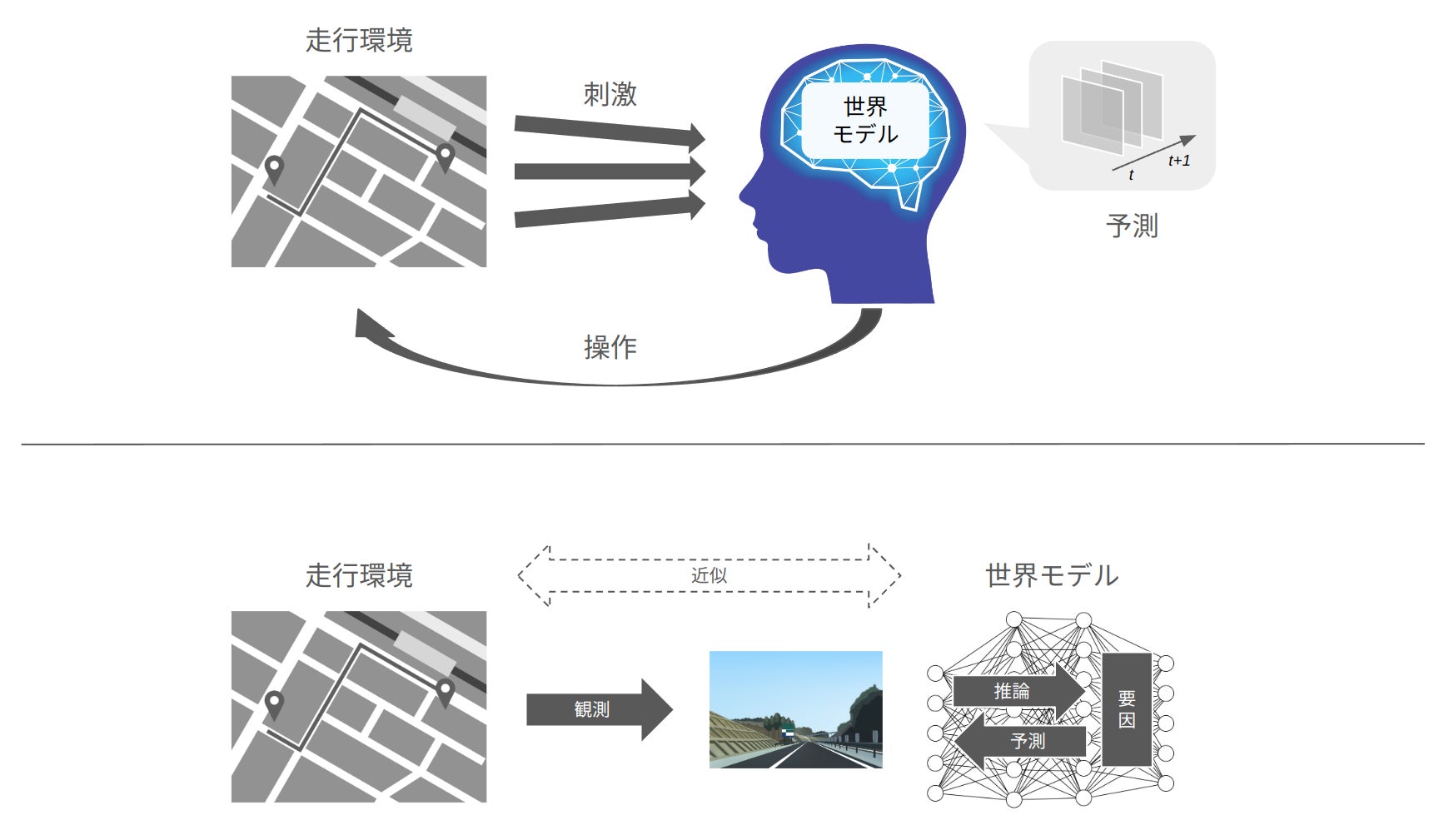 ティアフォーは、株式会社松尾研究所(以下「松尾研究所」)と2020年から自動運転に向けたAI技術開発に関する協業を行っており、世界モデルを含む自動運転ソフトウェアの基本コンポーネントの開発を進めています。世界モデルとは、観測情報に基づいて世界の構造を近似するように学習するモデルです。自動運転への応用を通して、現在のセンサなどの観測から未来の状況を予測し、それに基づいた運転の計画や学習を可能にすることを目指しています。