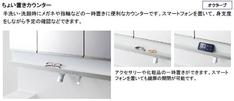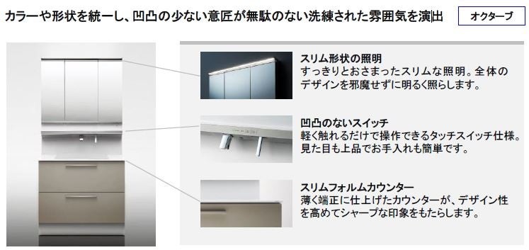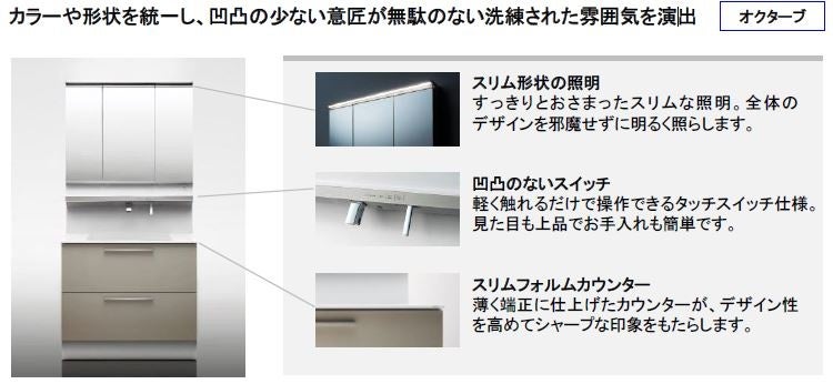 「オクターブ」は“タッチレス&スマート、スタイリッシュドレッサー”をコンセプトに、高まる衛生性に対応したすっきりしたデザインが特長の洗面化粧台です。手を触れずに操作できる「タッチレスお掃除ラクラク水栓」と「タッチレスワイドLED照明」に加え、TOTOのクリーン技術「きれい除菌水」を搭載できます。手洗い・洗顔時にメガネや指輪などの一時置きに便利なアイテム「ちょい置きカウンター」もご用意します。また、洗面化粧台を構成する部材のカラーや形状を統一し、凹凸を少なくすることですっきりしたデザインを実現しました。