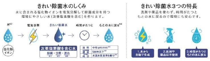 「きれい除菌水」※1は、水※2に含まれる塩化物イオンを電気分解して作られる除菌成分(次亜塩素酸)を含む水です。薬品や洗剤を使わず、水からつくられます。次亜塩素酸は安全性の観点から水道水質基準※3の範囲内の濃度で作られており、安全※3で、さらに時間がたつともとの水に戻る※4ので環境にやさしいのが特長です。