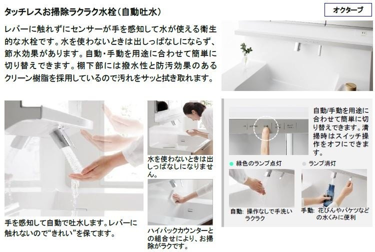①高まる衛生性に対応した「タッチレスお掃除ラクラク水栓」「タッチレスLEDワイド照明」搭載 (オクターブ)