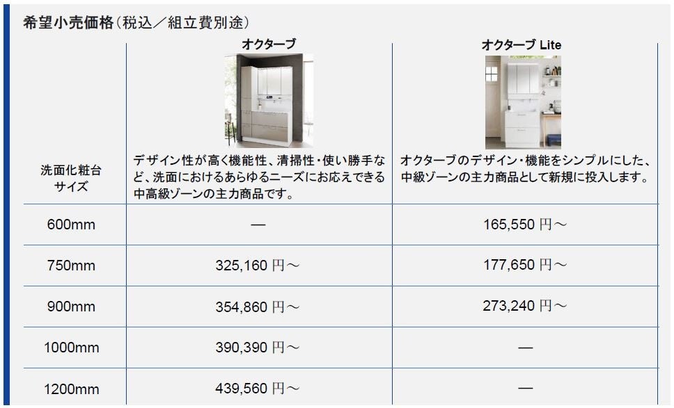 「オクターブ」は、発売以来、高い清掃性と収納力など先進の快適機能で人気の商品です。今回、「オクターブ」をフルモデルチェンジし、さらに新たにシンプルでお求めやすい価格の洗面化粧台「オクターブLite」を品揃えします。
