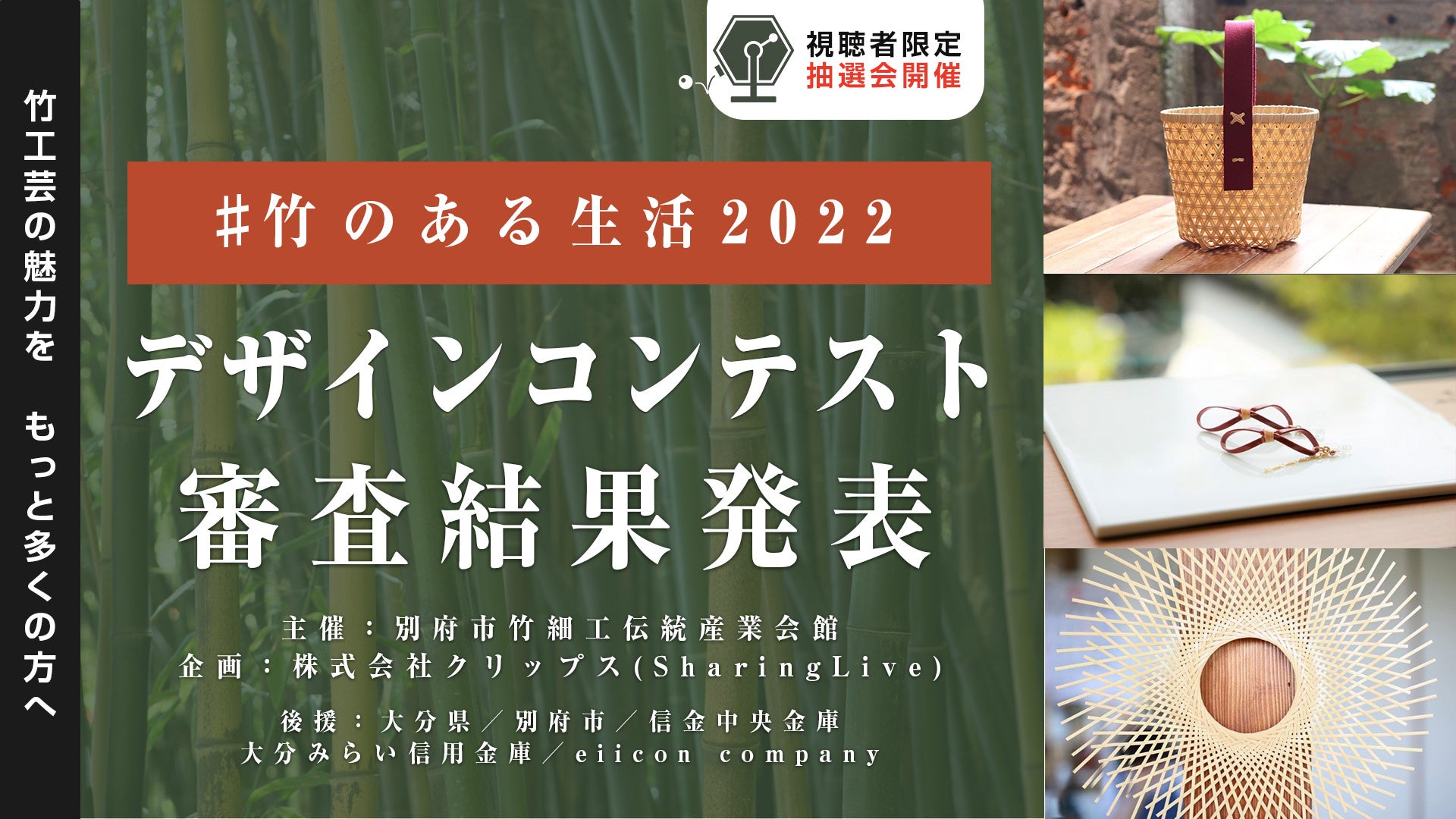 別府市竹細工伝統産業会館(大分県別府市)主催、株式会社クリップス(東京都渋谷区)企画による、『竹のある生活2022デザインコンテスト』の審査結果について、2022年11月11日(金)20時よりライブ配信にて発表いたします。配信は、クリップスが運営するライブコマースプラットフォーム『SharingLive』、ゲスト審査員でインテリアコーディネーターの広島知範氏のYouTubeチャンネル『インテリア王国』にて同時配信いたします。