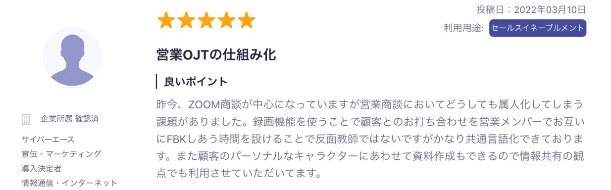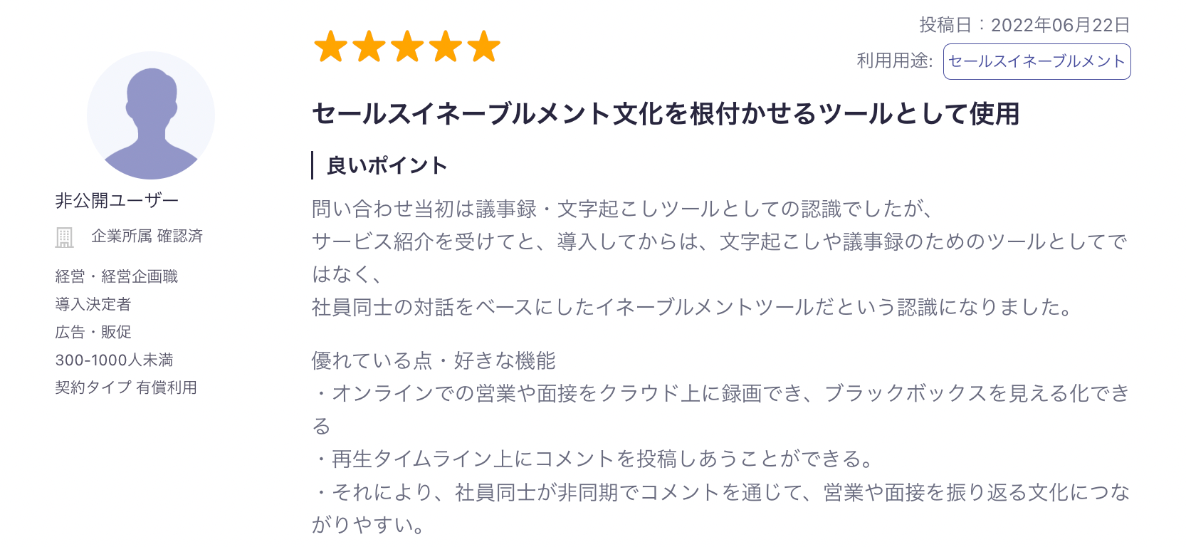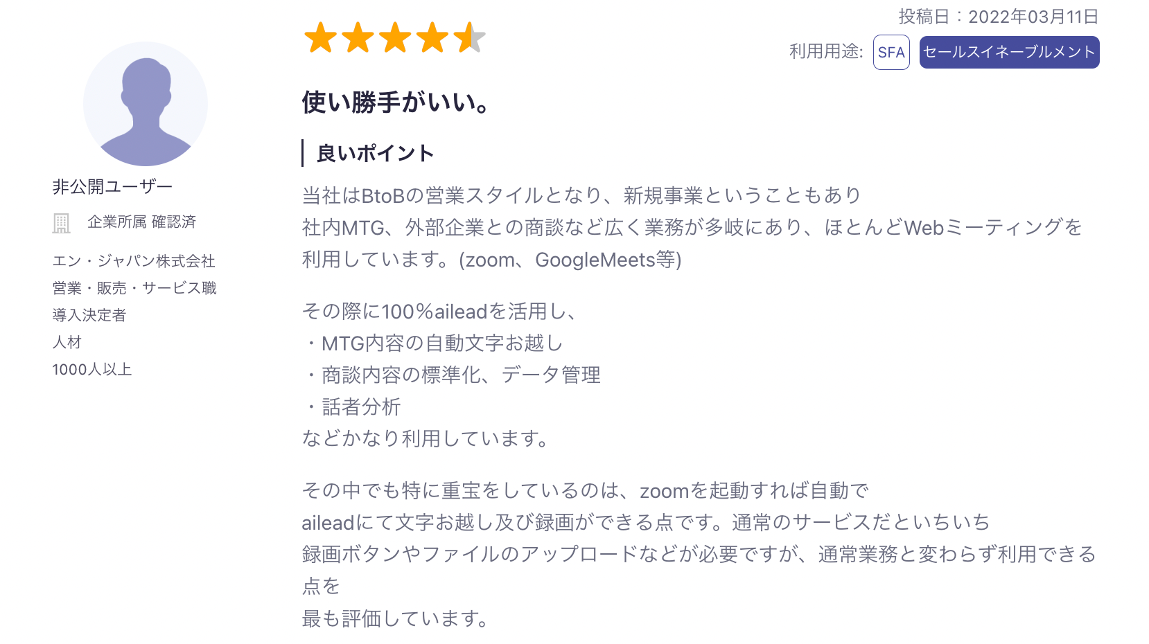 商談解析クラウド 「 ailead(エーアイリード)」は、2021年7月のサービス提供以来、ご利用いただいているユーザーの皆様の声に加え、ITreviewにていただくレビュー内容を参考として、機能追加・改善を続けてまいりました。今後も、お客様のニーズに寄り添ったサービス改善を進め、より幅広い業態・規模の企業にご利用いただけるよう、継続的な満足度向上を目指してまいります。