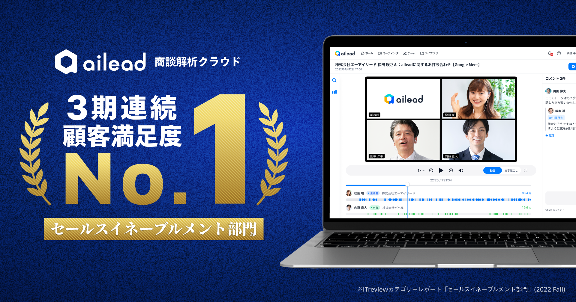 商談解析クラウド「ailead」、 ITreviewカテゴリーレポート 2022 Fall で3期連続で顧客満足度 No.1を獲得