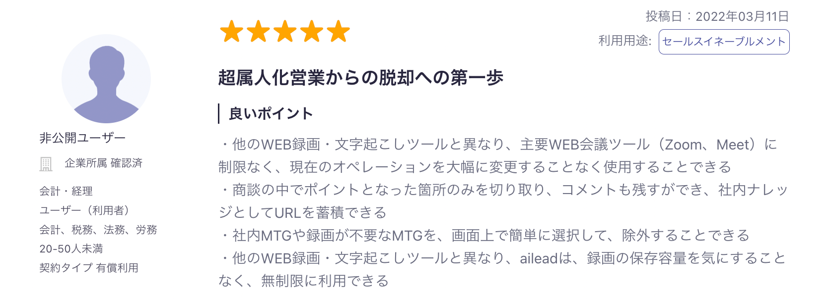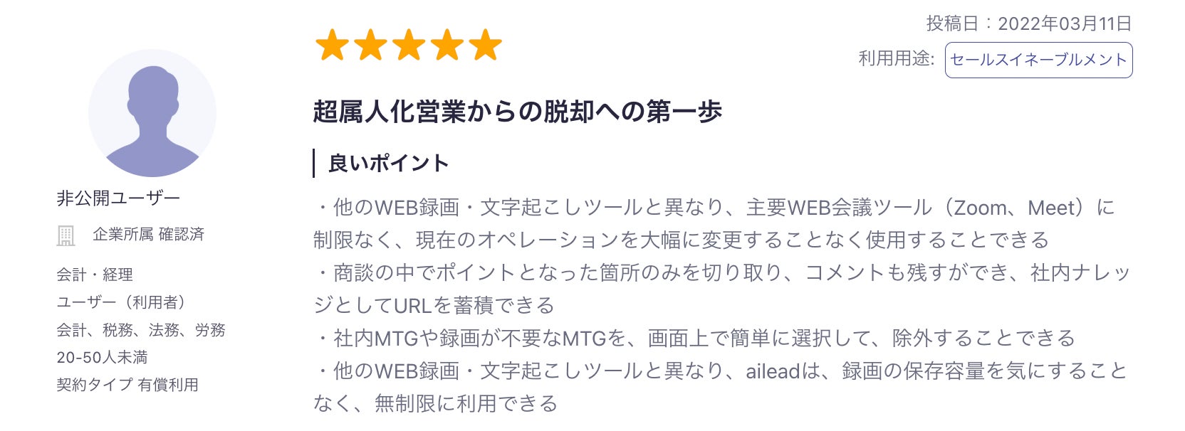 ▼ ailead(エーアイリード)のレビューページはこちらからご覧いただけます。