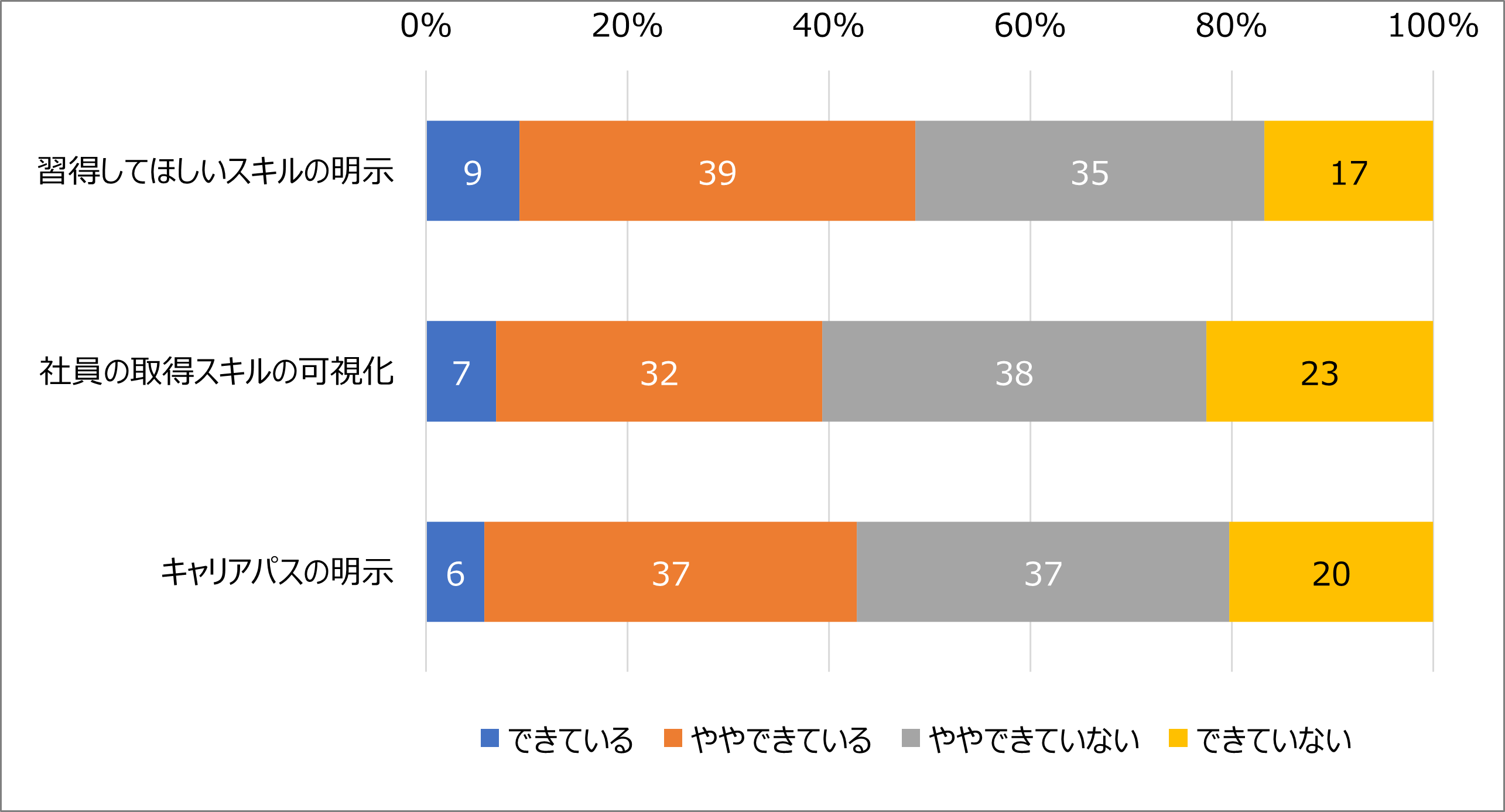 「習得してほしいスキルの明示」については、「できている」(9%)と「ややできている」(39%)との合計が48%と5割ほどとなっているが、「社内人材のスキルの可視化」については、「できている」(7%)と「ややできている」(32%)との合計が39%と、約4割にとどまっている。また、「キャリアパスの明示」については、「できている」(6%)と「ややできている」(37%)との合計が43%と、こちらも約4割となっている。