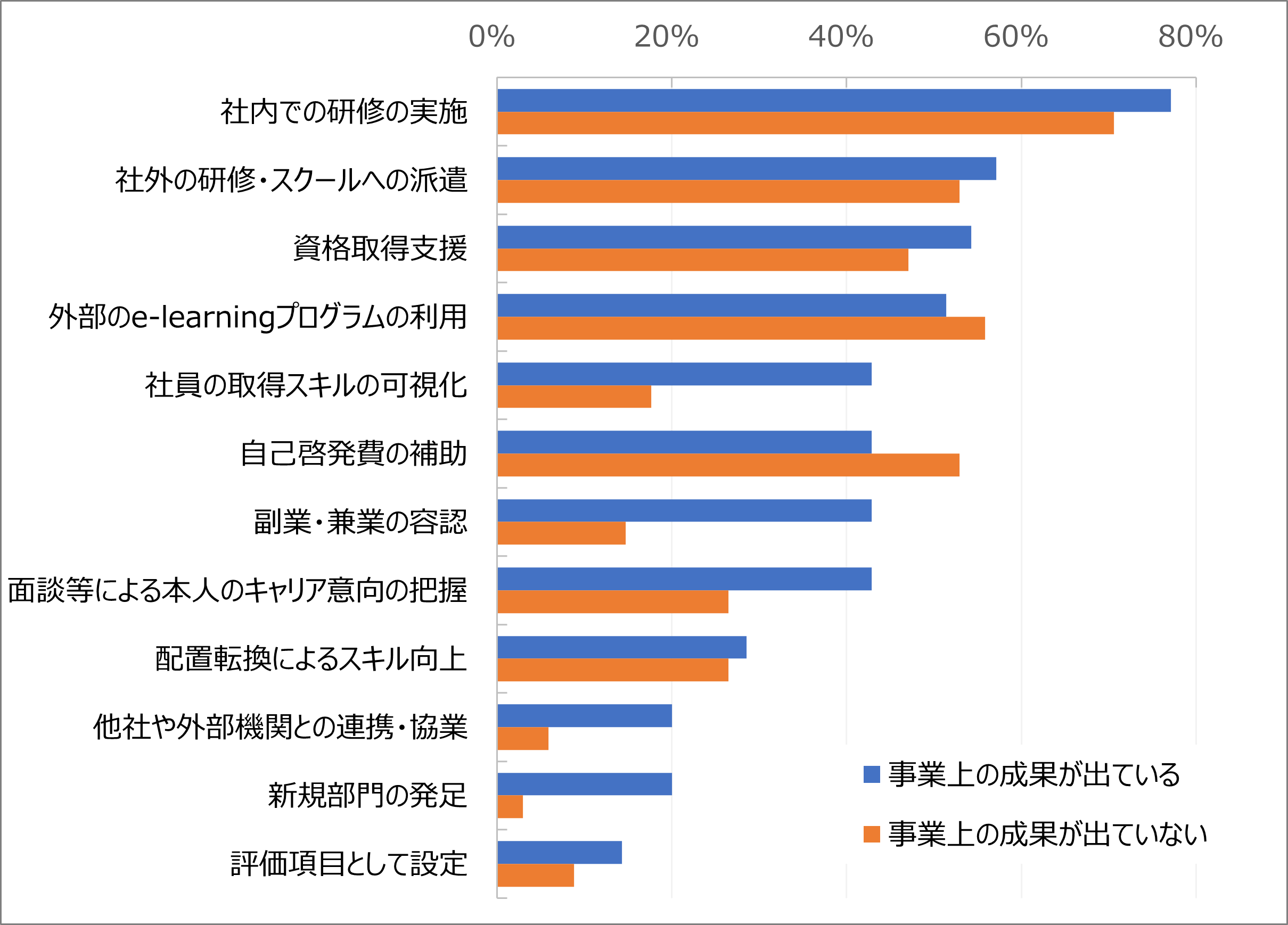 ▼事業上の成果別 社員のリスキリング推進のために実施している施策