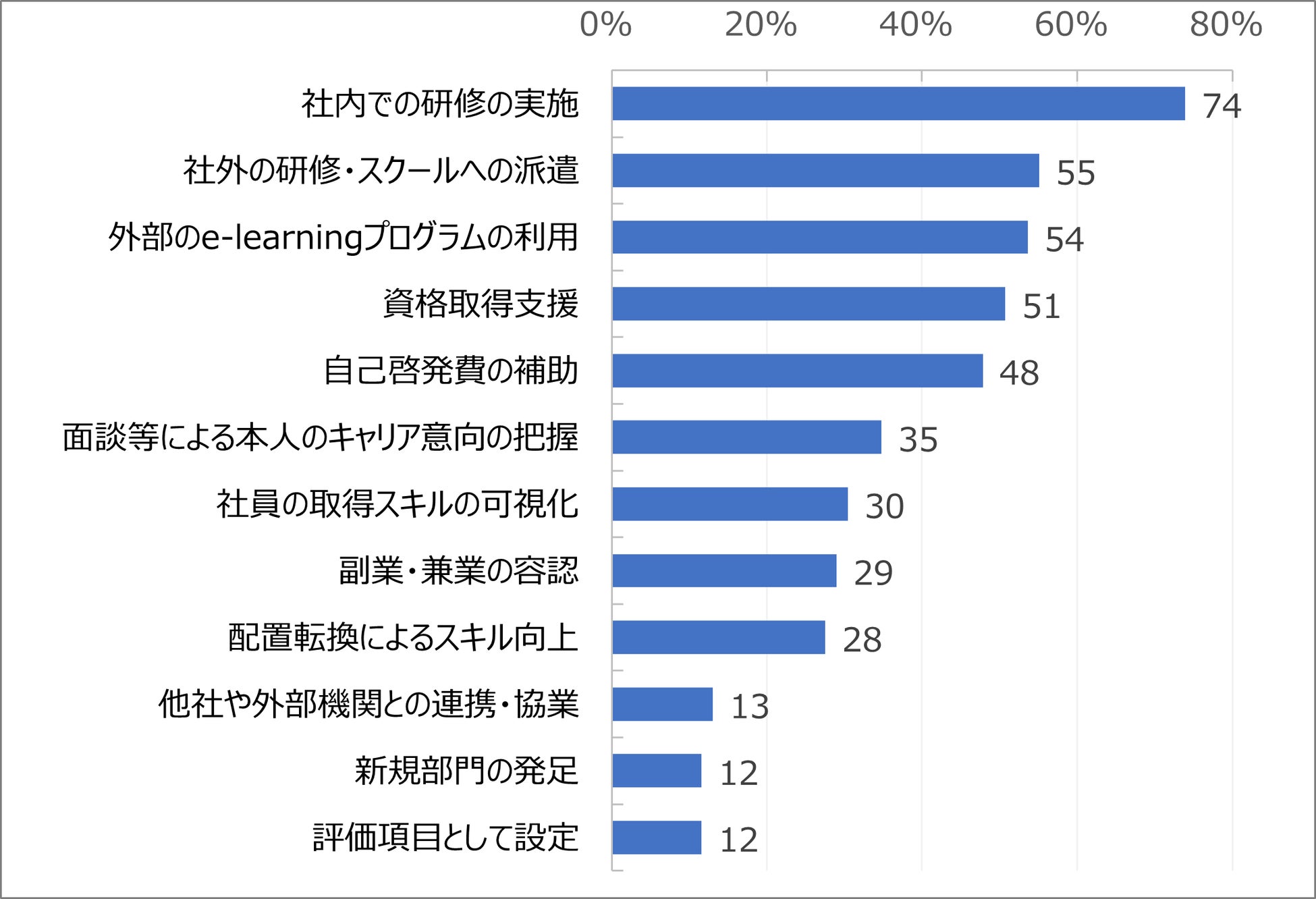 「社員のリスキリング推進のために実施している施策」について、具体的に見てみると、「社内での研修の実施」が最多で74%、次いで「社外の研修・スクールへの派遣」が55%、「外部のe-learningプログラムの利用」が54%などとなっている。