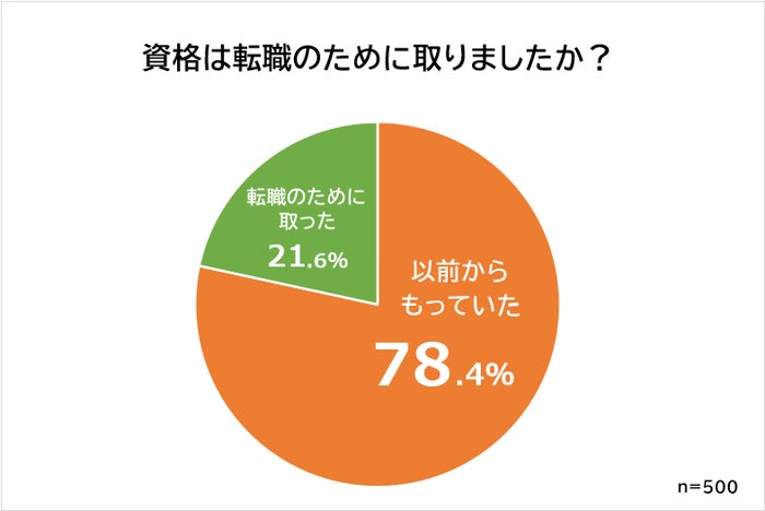 また転職のために新たに資格を取得した人は21.6%と少数派で、78.4%の人がすでに持っている資格を生かして転職していました。