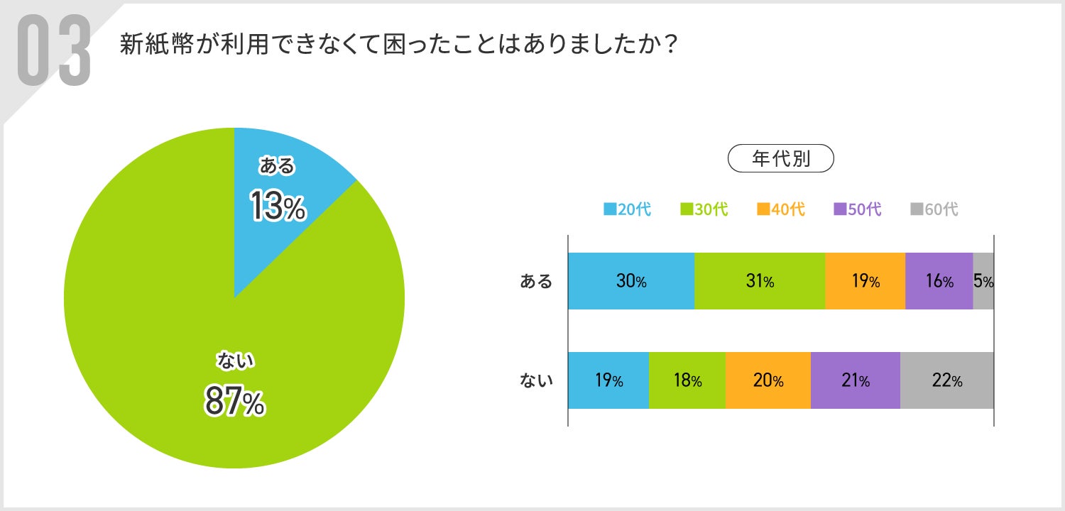 「新紙幣が利用できず困ったことはない」と回答した人は87%にのぼり、旧紙幣から新紙幣へのシフトがスムーズに出来ている、ということが伺えます。年代別に見ると「困ったことがある」と回答した中には20代30代の割合が高い傾向があるようです。次の設問で「困ったことがある」と回答した方に、具体的に困ったシチュエーションを伺いました。