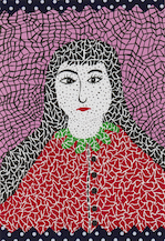 幼少より幻視や幻聴を体験し、その体験から水玉模様や網目模様をモチーフとした幻想的な絵画を制作する。