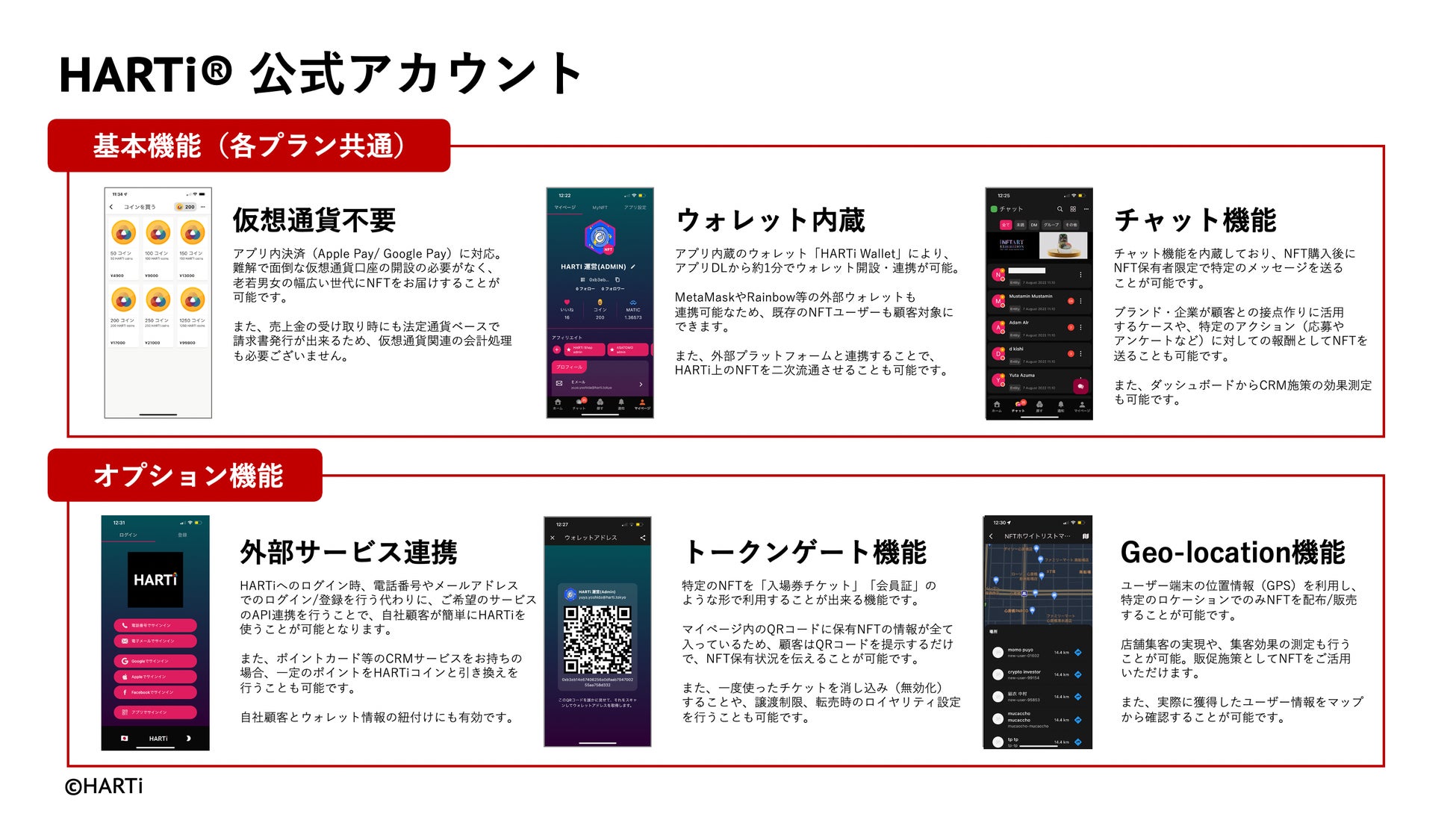 このアプリは、仮想通貨不要でNFTを購入できる機能や、アプリ内ウォレット「HARTi Wallet」を最短30秒で作成できる機能を中心に、初心者や知識の少ない方でも扱いやすいNFTの流通(無償配布・販売)機能を提供しています。