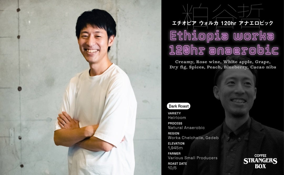 「高品質なエチオピアのアナエロビック(生豆の発酵方法のひとつ『嫌気性発酵』を取り入れた個性の強いコーヒー)を深煎りした、特別なコーヒーです。深煎りらしい芳醇でビターな香りのなかに、トロピカルフルーツやストーンフルーツを彷彿とさせる甘みが交錯する、複雑でユニークな味わいに仕上がっています(粕谷)」
