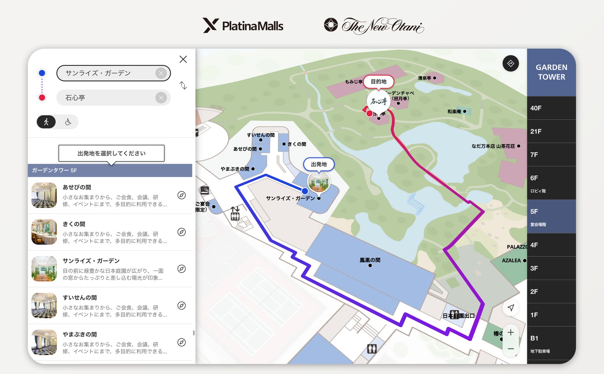 ボールドライト株式会社(本社:東京都新宿区、代表取締役社長:宮本章弘、以下、ボールドライト)が提供するデジタルフロアマップ・プラットフォーム「プラチナモール」を利用して作成された、ホテルニューオータニ(東京)の経路検索機能搭載デジタル館内マップが、2024年8月30日に公開されました。デジタル館内マップはお客様のスマートフォンのWEBブラウザから閲覧でき、経路検索を使って、広い館内も迷うことなく移動することができるようになります。またデジタルマップは英語表示もされ、インバウンドのお客様にとってもより便利に快適にホテル滞在を楽しんで頂けるようになります。