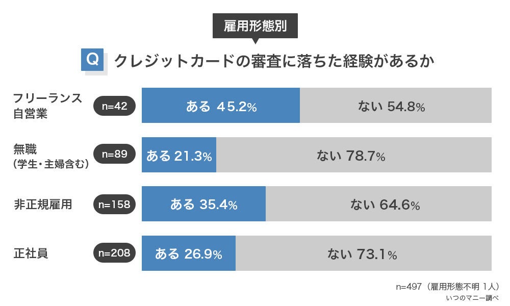 フリーランスは収入が不安定なためクレジットカードがつくりにくいことが、数字でも示されたかたちです。
