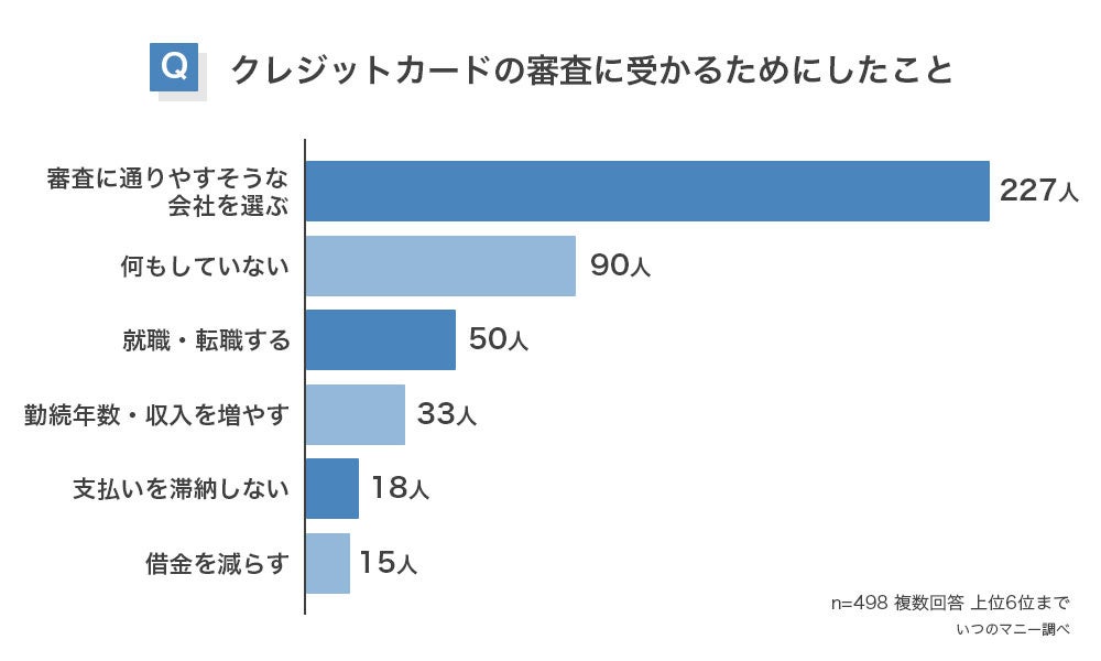 クレジットカードの審査に不安を感じたことがある498名に「審査に受かるためにしたこと」を聞いたところ、1位になったのは「審査に通りやすそうな会社を選ぶ(227人)」でした。