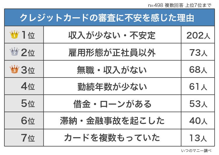 クレジットカードの審査に不安を感じたことがある498名に「不安を感じた理由」を聞いたところ、1位は「収入が少ない・不安定(202人)」、2位「雇用形態が正社員以外(73人)」、3位「無職・収入がない(68人)」という結果に。