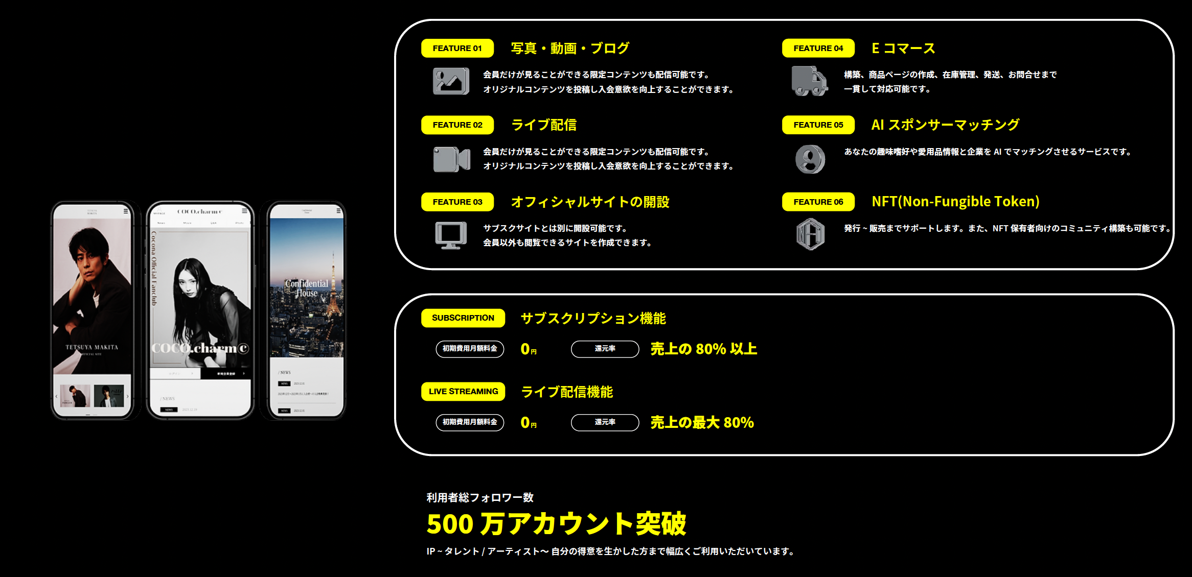 あなただけの"コミュニティ"、"オンラインサロン"、"ファンクラブ"、"配信サイト"を始めることができます。