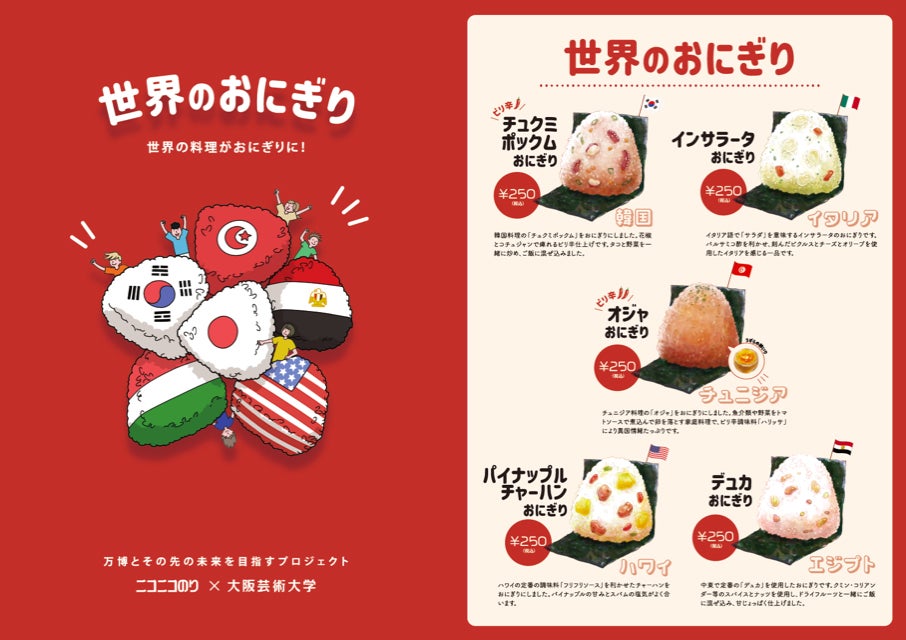本取り組みの第一弾として、2022年10月29日(土)、30日(日)に開催される「ららぽーとEXPOCITY キッチンカーイベント」にニコニコのりが運営するおにぎらず専門店 笑屋 NICO-YA キッチンカーを出店し、大阪芸術大学の学生が共同開発として携わった商品「世界のおにぎり」を発売いたします。