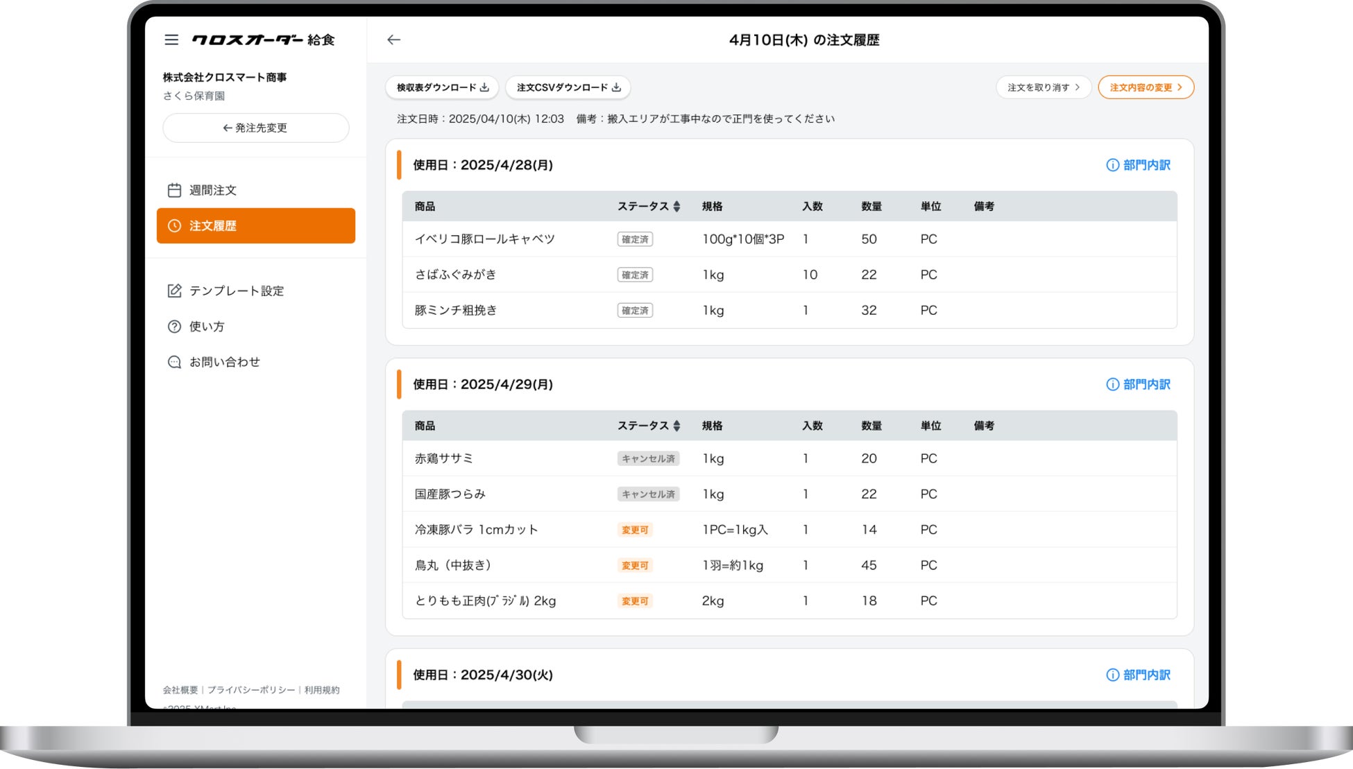 PCブラウザからの入力に加え、既存の献立ソフトで出力したCSVをアップロードするだけで発注が完了。