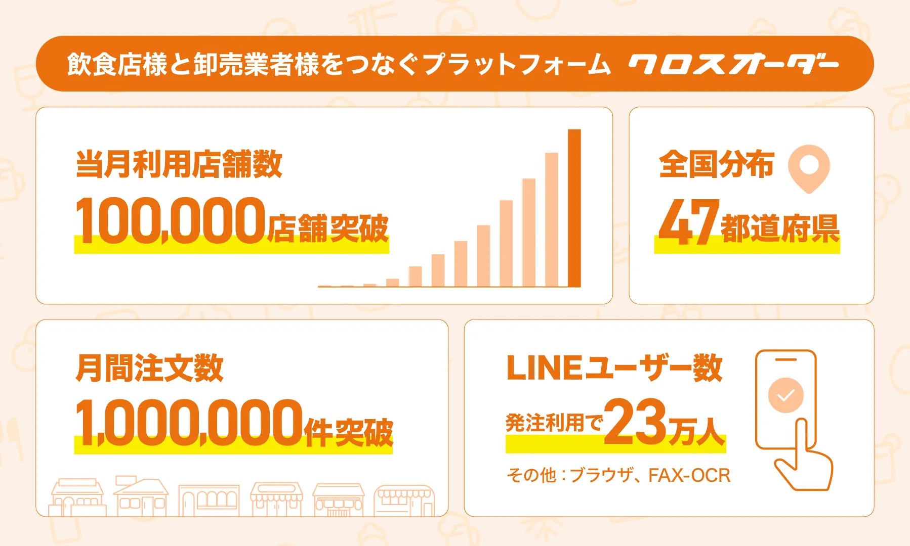 クロスオーダーは、飲食店様と卸売業者様をつなぐプラットフォームです。FAXや電話が主流だった受発注業務をスマートフォン上のLINEに切り替え業務効率化を推進する「クロスオーダー受発注」、LINEを活用したオンライン販促機能「クロスオーダー販促」、請求書・見積書・納品書のDX機能「クロスオーダー帳票」など、飲食店様と卸売業者様のあいだのアナログな業務をデジタル化する機能を次々と展開しています。2019年11月のサービス提供開始から約5年で、当月のアクティブな利用店舗数は100,000店舗を突破し、2025年3月現在、110,000店舗を超える飲食店様が日々発注でクロスオーダーを使ってくださっています。