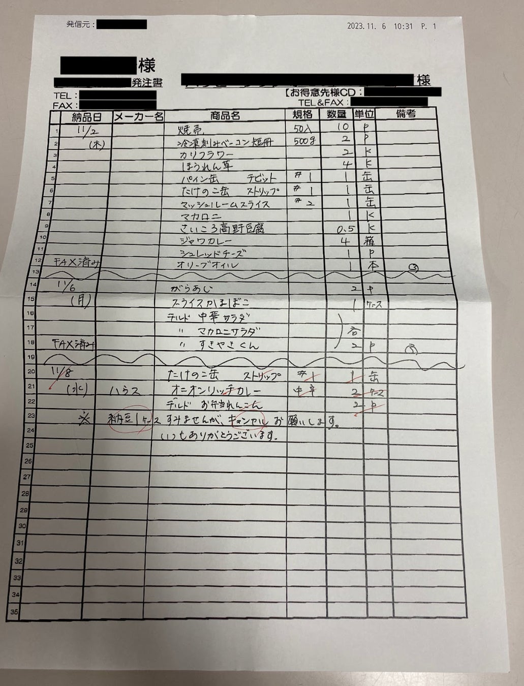 幼稚園・保育園給食や企業・病院・介護施設給食の現場では、いまなおFAX・電話での発注が主流です。発注担当者は毎回同じ内容を紙に転記し送信する、という非効率な作業に追われています。受注側では届いた発注書を再入力する手間が発生し、その過程で入力ミスや「送った・届いていない」「言った・言わない」といった伝達トラブルも起こりがちです。