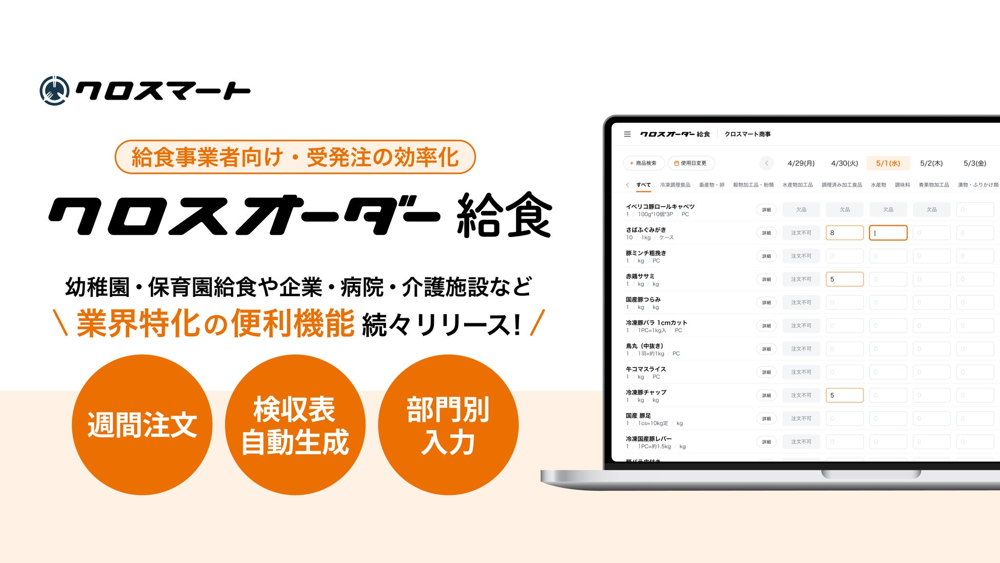 食品流通のDX(デジタルトランスフォーメーション)を推進するクロスマート株式会社(本社:東京都中央区、代表取締役:寺田 佳史、以下「当社」)は、外食事業者向け受発注プラットフォーム「クロスオーダー」に続き、給食事業者向け受発注プラットフォーム 「クロスオーダー給食」 の提供を開始しました。FAXや電話に依存していた給食事業者の受発注業務をデジタル化し、発注側・受注側双方の作業時間とコストを大幅に削減します。