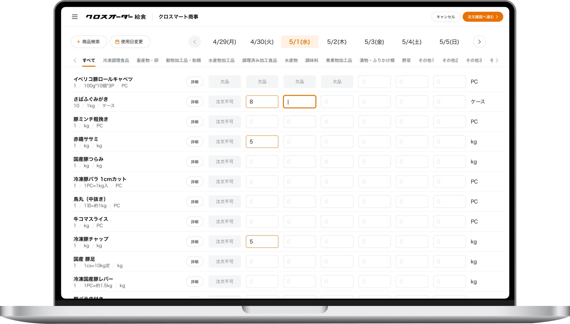 使用日単位・週間単位の数量入力に対応し、1回の操作で1週間分を一括発注。数量変更もワンクリックで行うことができます。
