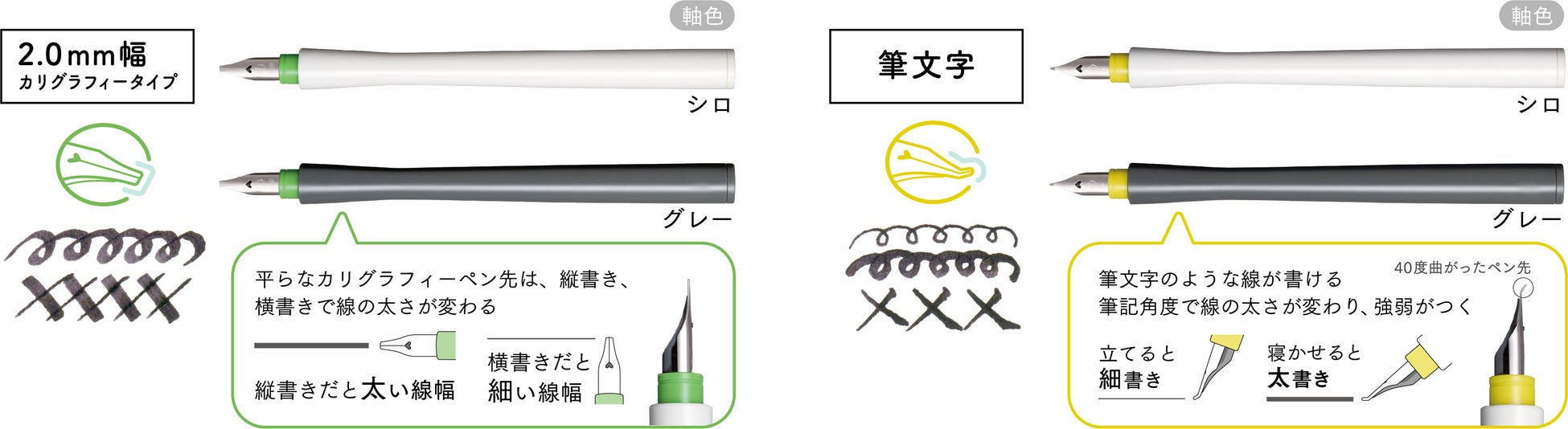 万年筆用ボトルインクを、より簡単手軽に利用できる万年筆ペン先のつけペンとして昨年の12月に発売した細字・1.0mm幅に続き、インクの楽しみ方を更に広げる新ペン先として、太い線幅の文字が書ける2.0mm幅と筆文字タイプを発売いたします。インクの消費が多い太い字幅のペン先のためにインクを保持するリザーバーパーツ付きで十分な筆記距離を確保しています。