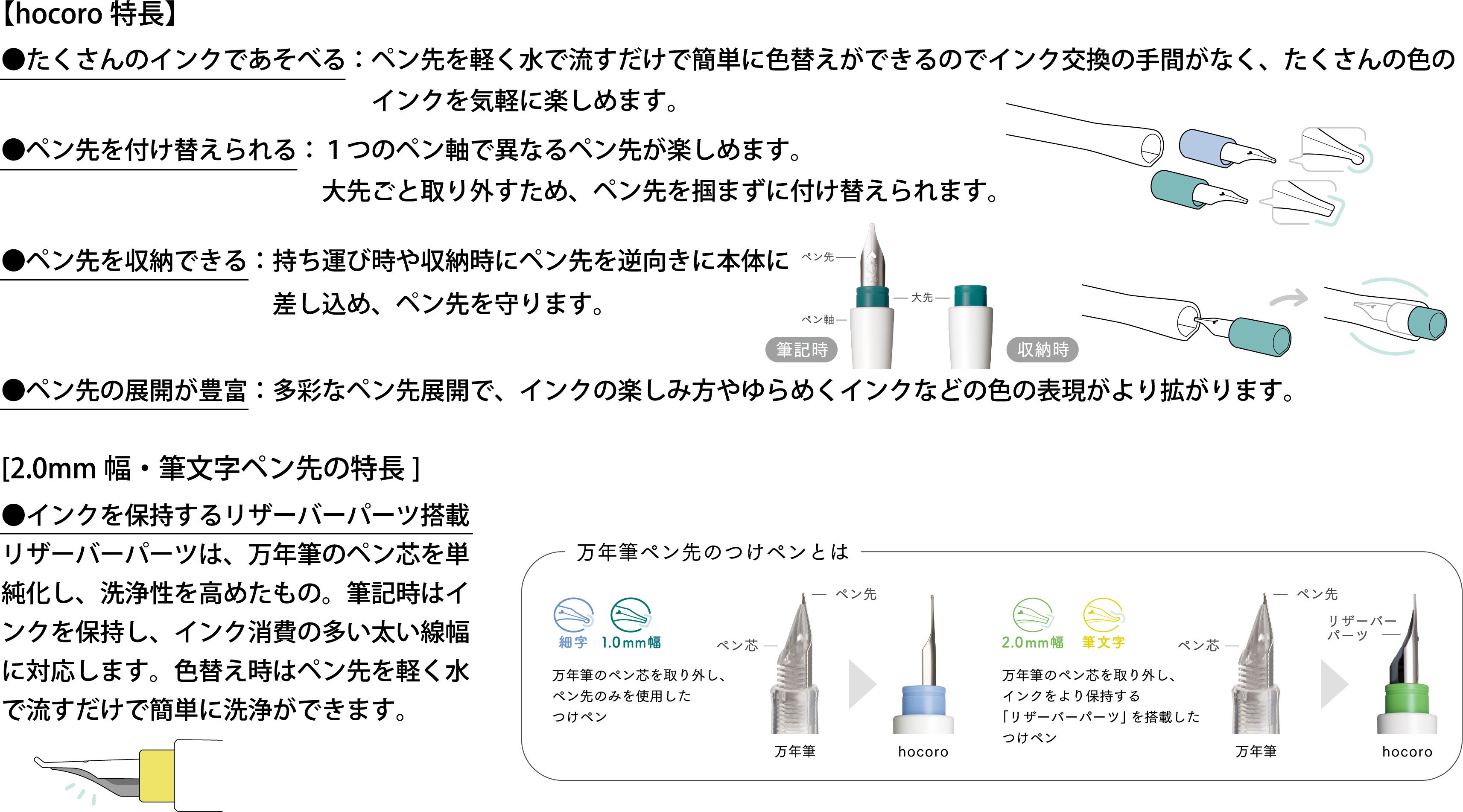 もっと気軽に、もっとタフに、万年筆用インクであそべる! 『万年筆ペン先のつけペン hocoro(ホコロ)』新ペン先〈2.0mm 幅・筆文字〉&リザーバーパーツ