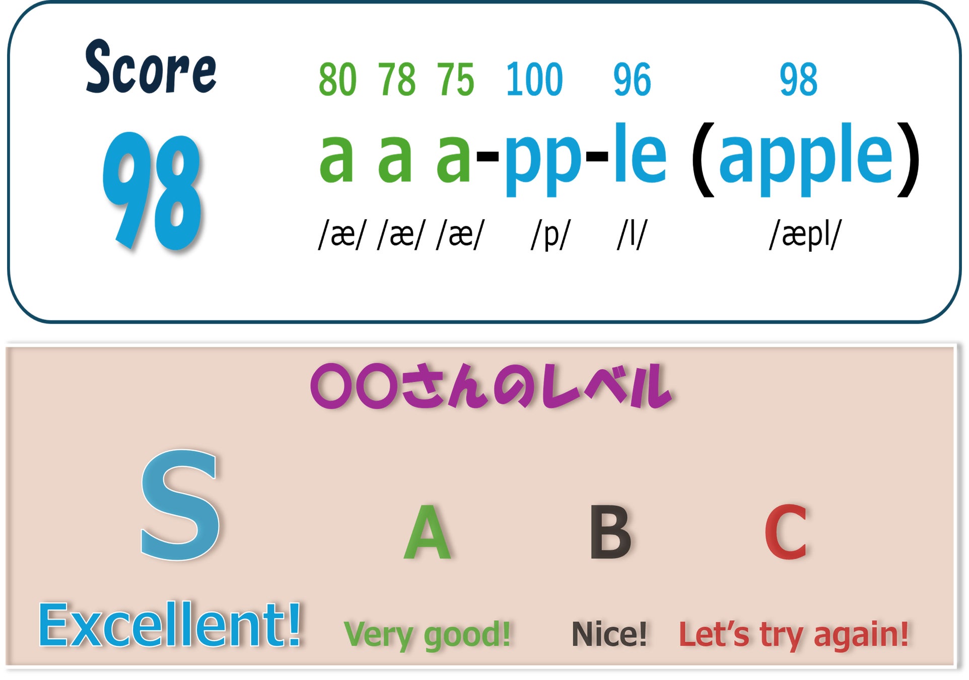 新カーネルでは、アルファベットの発音・単語の発音を音素レベルで評価することが可能です。アルファベットの発音に、単語の始めの音(initial sound)を関連付けて覚えるというフォニックスの学習法(例:a a apple, b b book, c c cat) に対応しており、それぞれの音素ごと・単語全体のそれぞれに対して発音を評価しスコアをフィードバックします。