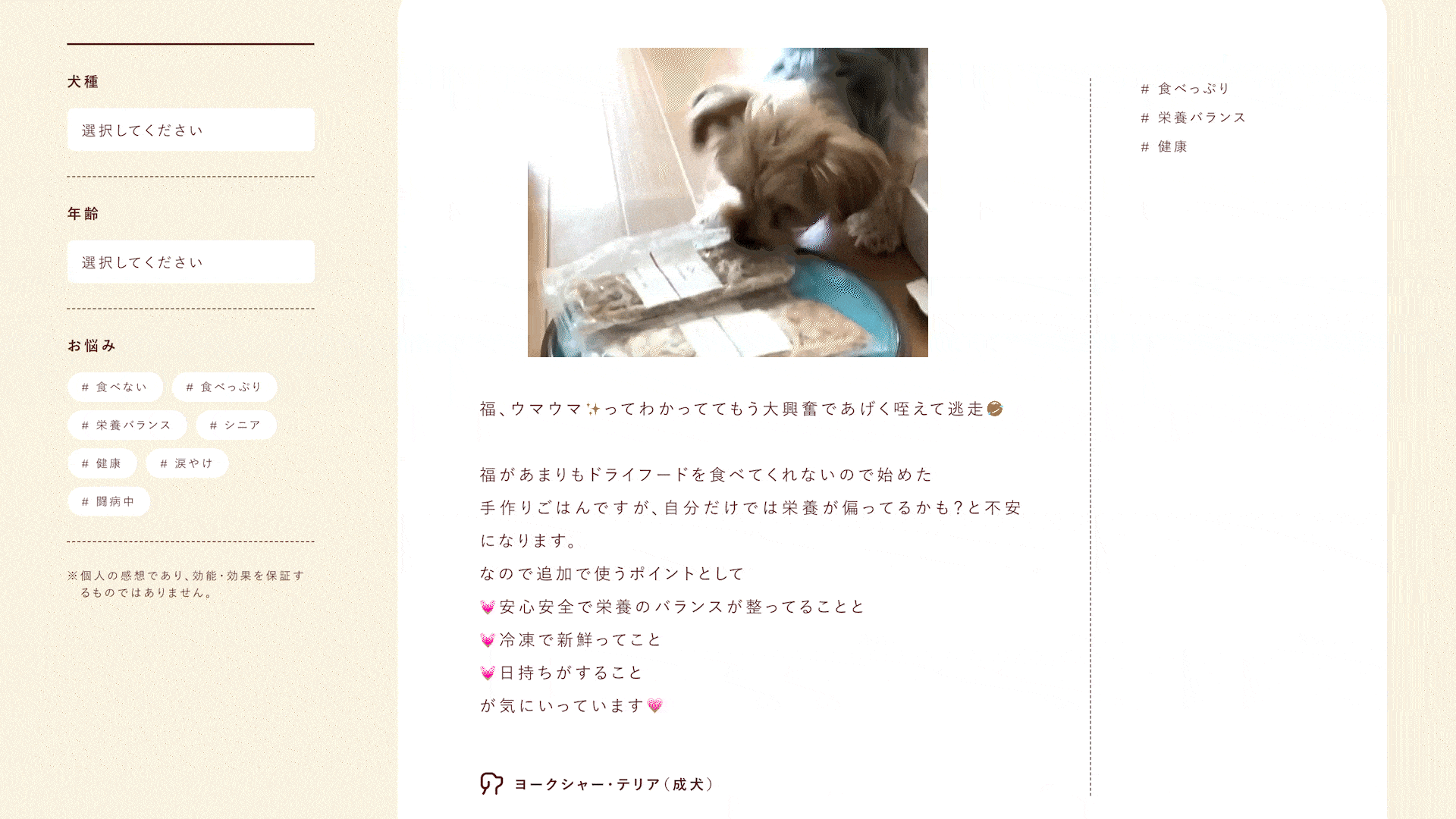- 愛用者様の口コミを掲載。犬種、年齢、お悩み別に検索できる機能も搭載