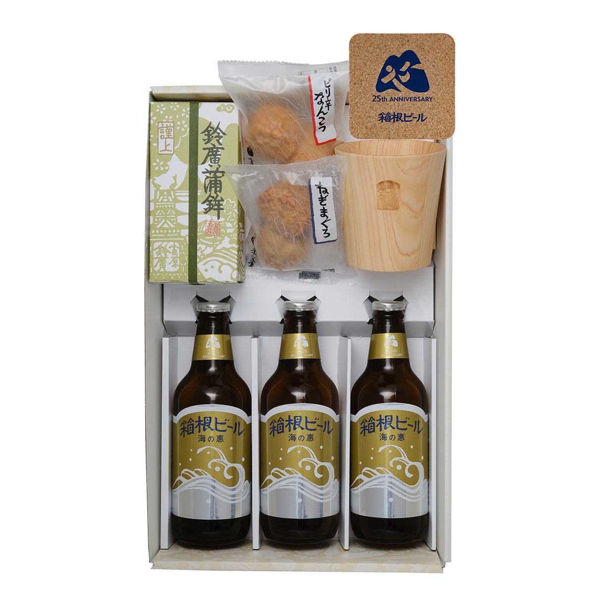 箱根ビール25周年を記念して開発したクラフトビール「海の恵み」は、華やかな香りと優しい味わいが魅力。地元の間伐材を使用したオリジナルタンブラー付き。