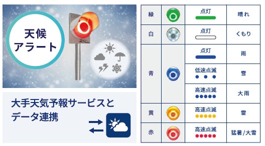 現場の1時間後の天気予報をライトの色で表示することができます。天気予報をこまめに確認することが難しい現場で、手軽に天気の予測と周知が行えるため作業の効率化や安全性の向上が期待できます。