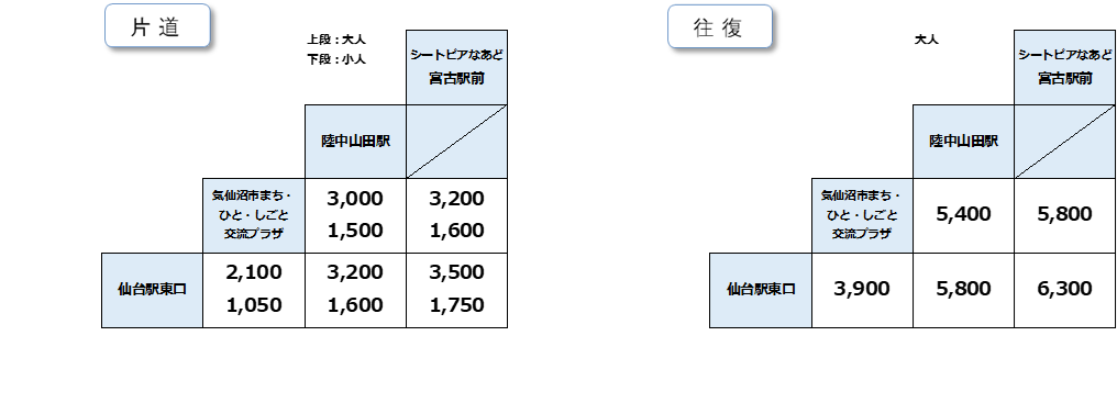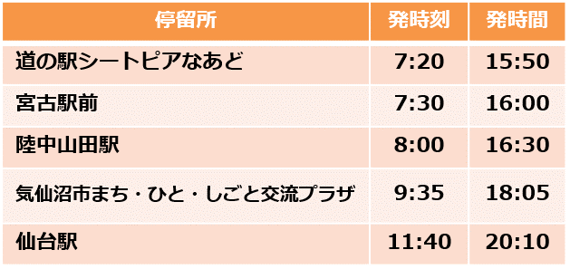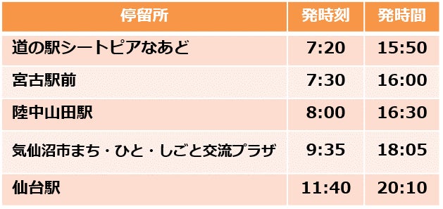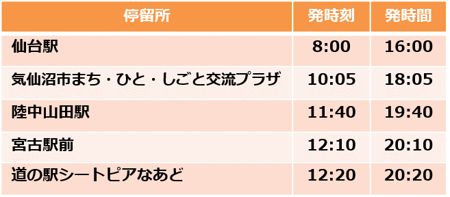 道の駅シートピアなあど(宮古市内)-宮古駅前-陸中山田駅前-気仙沼市まち・ひと・しごと交流プラザー仙台駅東口