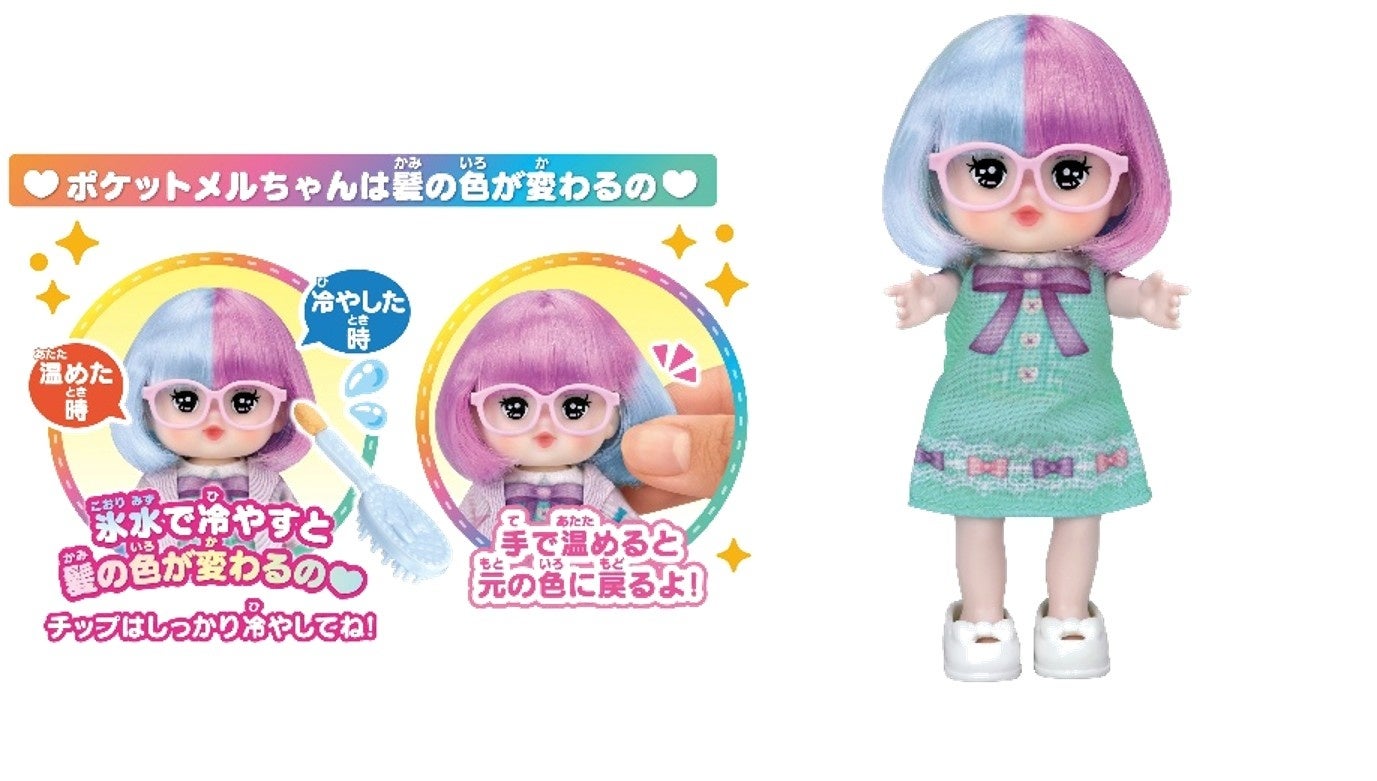 ブラシに付いているチップに氷水をつけて、髪の毛を冷やすとパステルブルーからマゼンタに変わり、温めると元の色に戻ります。てのひらサイズなので、いつでもどこでもいっしょにいられます。お部屋でも、お風呂でも、お外でもいろんな場所につれていってくださいね。また、ドクターラブのメガネと白衣は、ポケットメルちゃんやおともだちに着せ替えをして楽しむことができます。