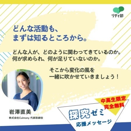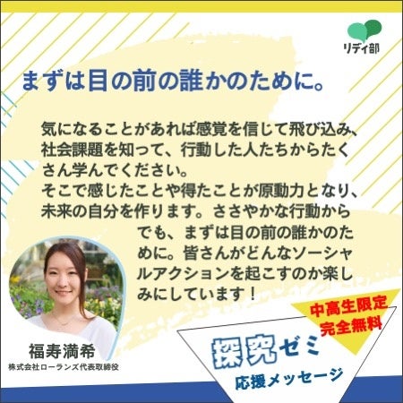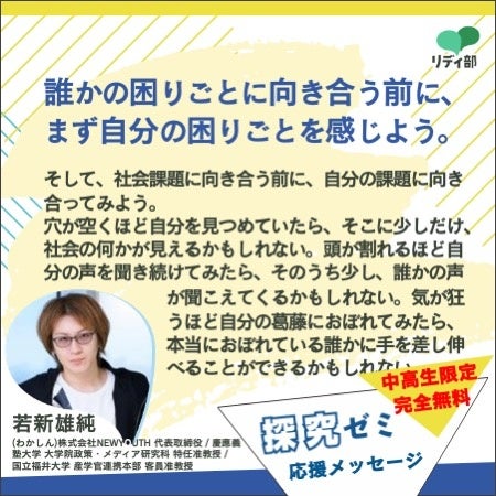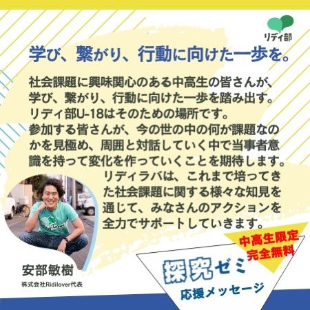 株式会社Ridilover(以下「リディラバ」代表取締役:安部敏樹)は中高生が社会課題を学び、話し、自分や社会の未来、社会問題の解決策を考える「探究ゼミ」を9/4(水)より開講します。