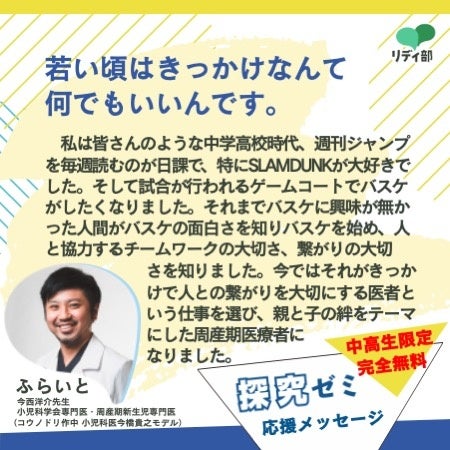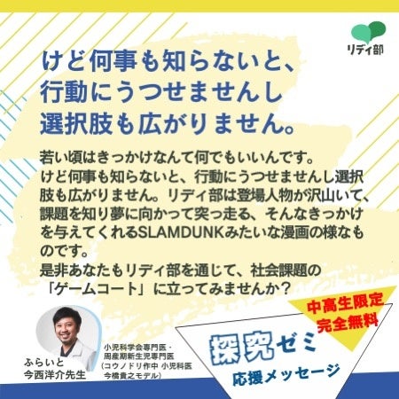私は皆さんのような中学高校時代、週刊ジャンプを毎週読むのが日課で、特にSLAMDUNKが大好きでした。そして試合が行われるゲームコートでバスケがしたくなりました。それまでバスケに興味が無かった人間がバスケの面白さを知りバスケを始め、人と協力するチームワークの大切さ、繋がりの大切さを知りました。今ではそれがきっかけで人との繋がりを大切にする医者という仕事を選び、親と子の絆をテーマにした周産期医療者になりました。若い頃はきっかけなんて何でもいいんです。けど何事も知らないと、行動にうつせませんし選択肢も広がりません。リディ部は登場人物が沢山いて、課題を知り夢に向かって突っ走る、そんなきっかけを与えてくれるSLAMDUNKみたいな漫画の様なものです。是非あなたもリディ部を通じて、社会課題の「ゲームコート」に立ってみませんか?