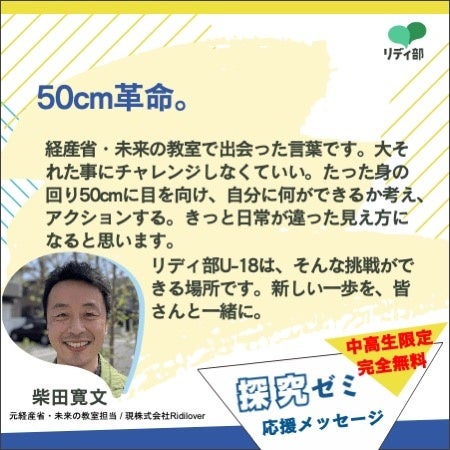 経産省・未来の教室で出会った言葉です。大それた事にチャレンジしなくていい。たった身の回り50cmに目を向け、自分に何ができるか考え、アクションする。きっと日常が違った見え方になると思います。