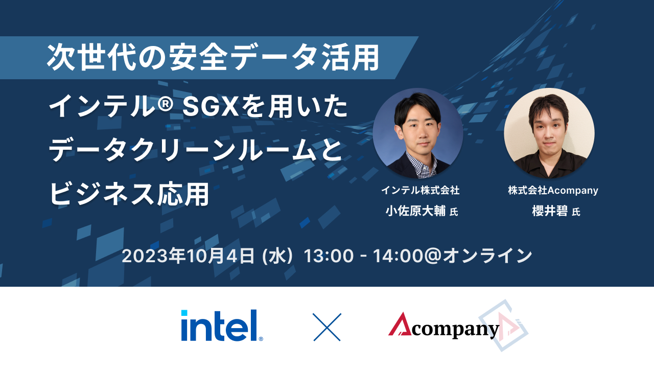 Acompanyはインテルと共同で、「【次世代の安全データ活用】 インテル® SGXを用いたデータクリーンルームとビジネス応用」を10月4日(木)13:00-14:00オンラインにて開催します。