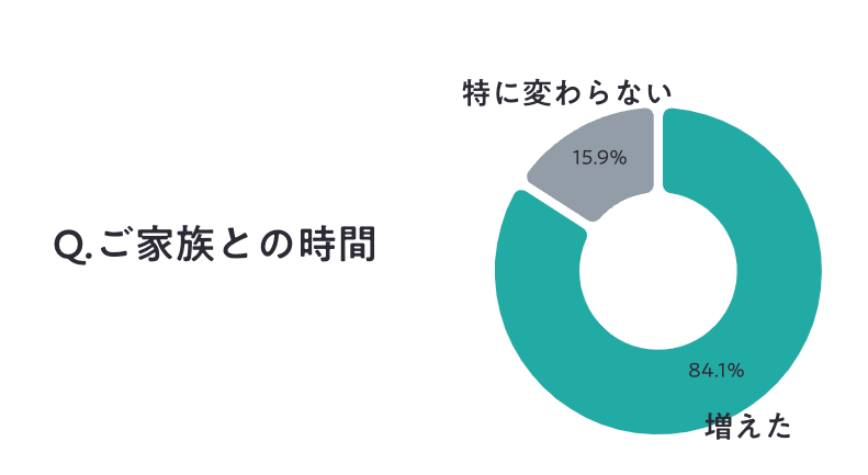 次に「前職時と比較した子供や家族と接する時間の変化」について聞いたところ、84.1%が「増えた」と回答。15.9%が「特に変わらない」と回答。「減った」は0%という回答結果でした。