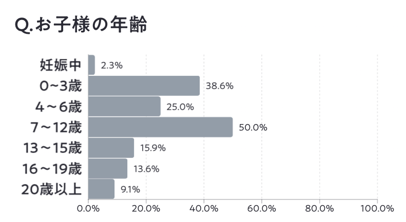 次に「子供の年齢」を聞いたところ、50%が「7〜12歳」、38.6%が「0〜3歳」、25%が「4〜6歳」、15.9%が「13〜15歳」という回答結果でした。