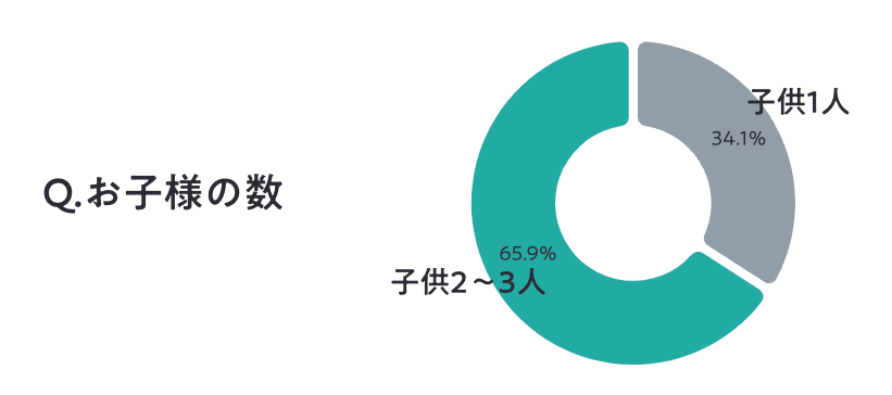 TERASSに所属する子育て中の不動産エージェント(20〜60代男性)44名を対象に、「子供の人数」を聞いたところ、「2〜3人」が最も多く65.9%、次いで「1人」が34.1%、「4人以上」が0%という回答結果でした。