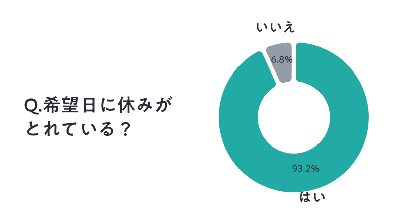 次に「育休や土日祝を含め、希望する日にお休みは取れていますか(調整できていますか)?」と聞いたところ、93.2%が「はい」と回答。6.8%が「いいえ」という回答結果でした。