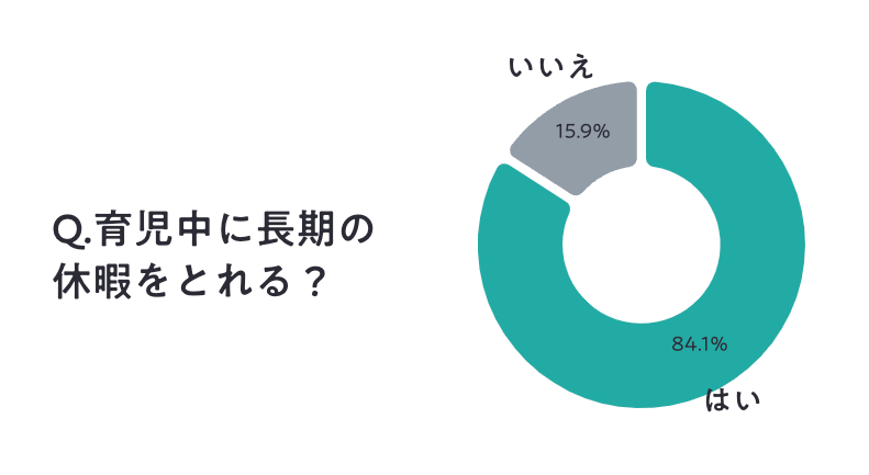 次に「今後子供が生まれた場合、育児に関する長期の休みを取得または、積極的に子育て優先する時間を設けられると思いますか?」と聞いたところ、84.1%が「はい」と回答。15.9%が「いいえ」という回答結果でした。