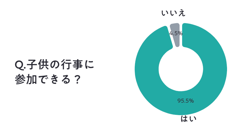 次に「TERASSに参画して、子供や家族のイベントに以前より参加できるようになりましたか?(誕生日や運動会、家族旅行など)」と聞いたところ、95.5%が「はい」と回答。4.5%が「いいえ」という回答結果でした。