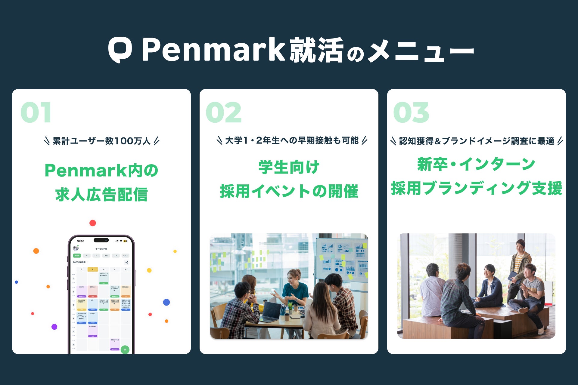 Penmark就活は、新卒採用を行う全国の企業様を対象に、以下のサービスを提供いたします。