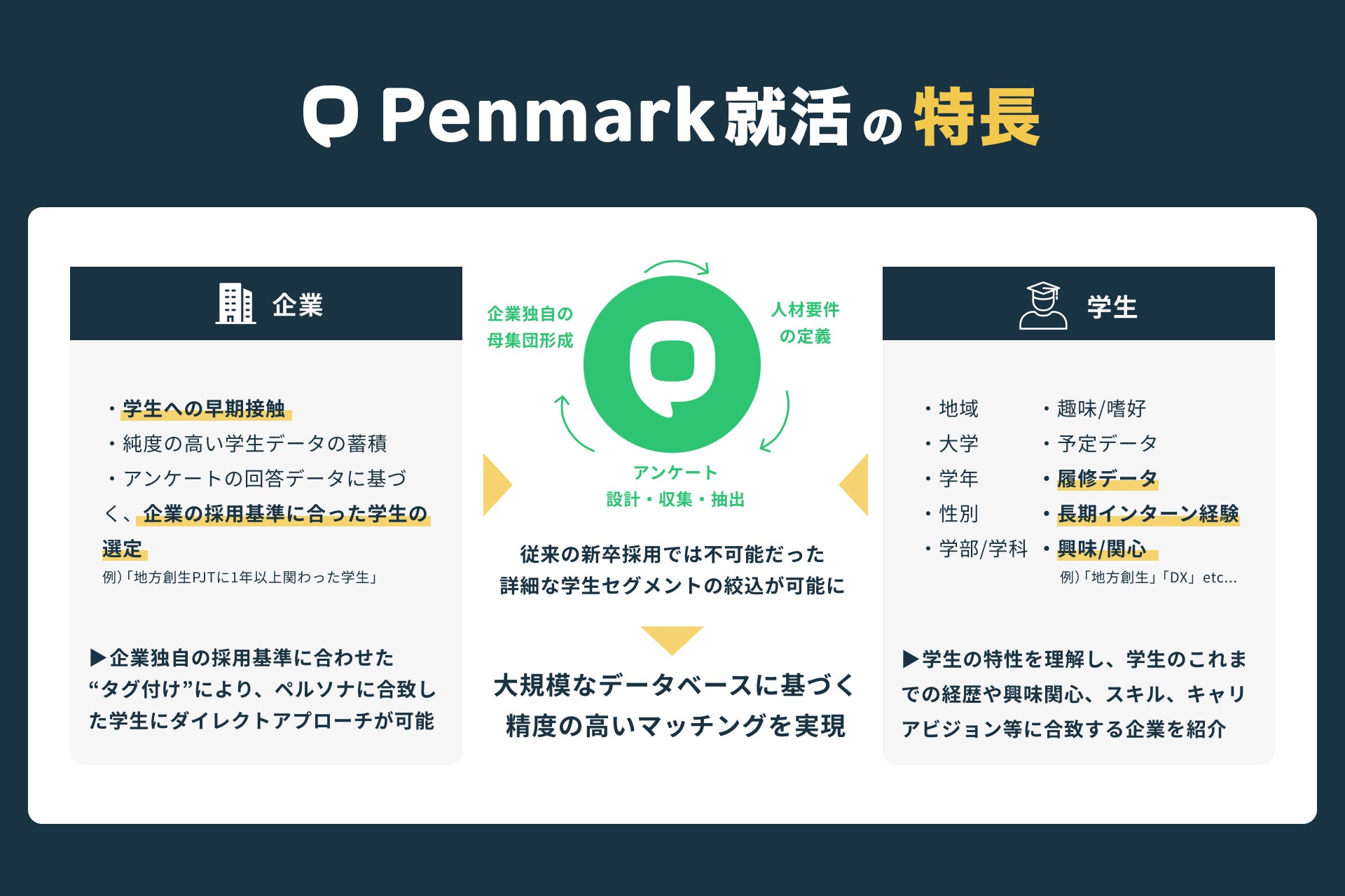従来の新卒採用市場では、学生と企業の情報格差やマッチングの非効率性が課題となっていました。Penmark就活は、当社の2つの強みを活かすことで、これらの課題解決を目指します。