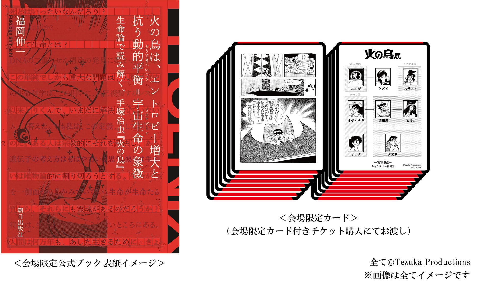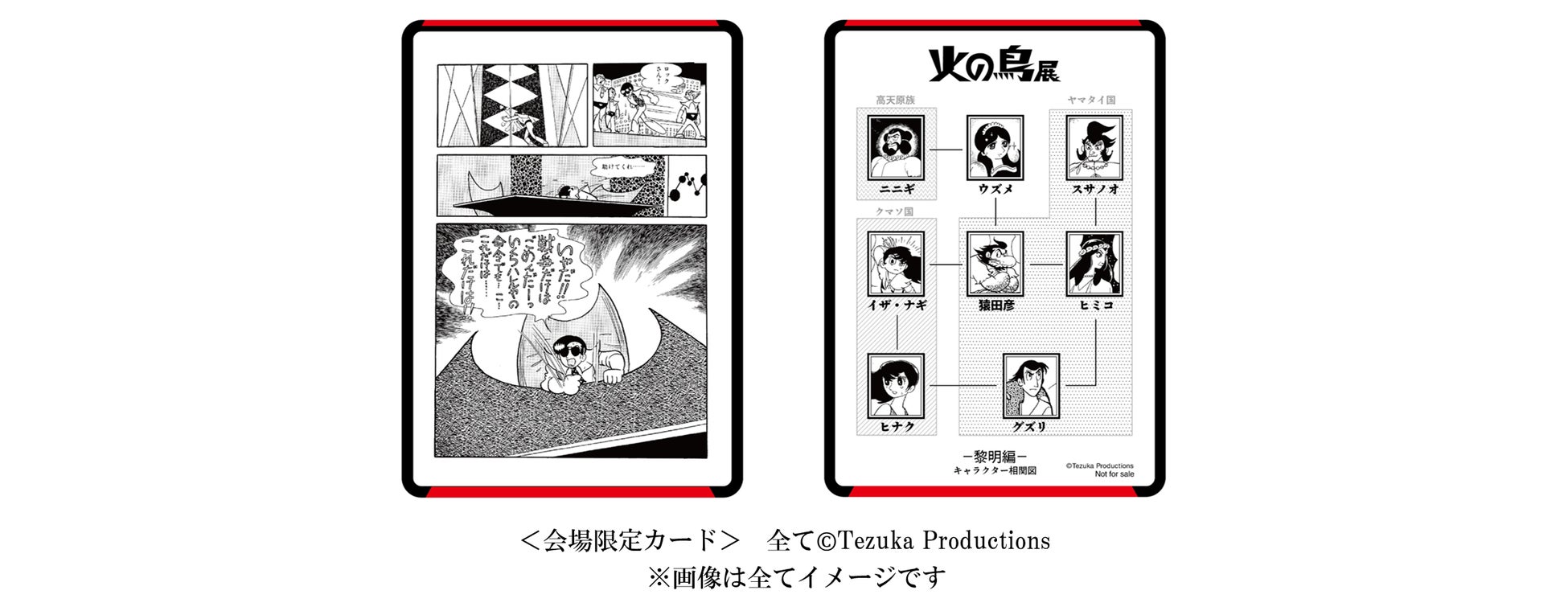 『火の鳥』の代表的なページやコマ、登場キャラクターの相関図を各編ごとにデザインした全12種のカード(前期6種、後期6種)から1枚を会場にてお渡しします。どのカードが当たるかは会場でのお楽しみ!