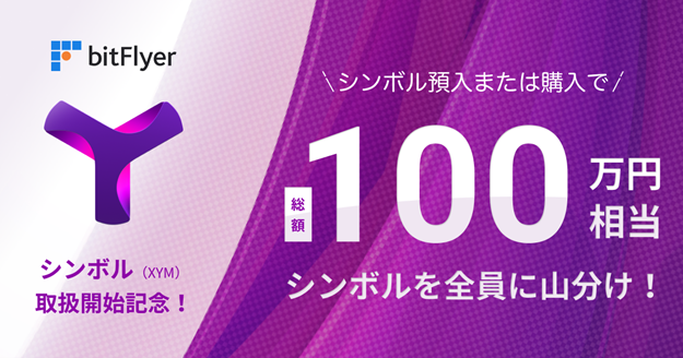 「シンボル(XYM)」の取り扱いを記念して、所定の数量以上の同暗号資産を預入いただく、または、bitFlyerにて取り扱い中のいずれかの暗号資産を購入いただいたお客様全員に、総額 100 万円相当の「シンボル(XYM)」を山分けしてプレゼントします。